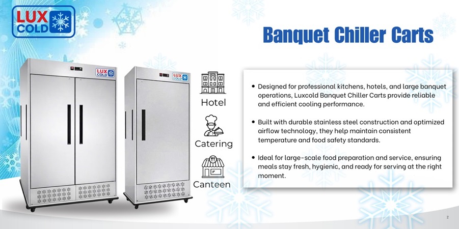 Tủ lạnh di động cao cấp Luxcold được thiết kế chuyên dụng cho tiệc Banquet – Buffet – Sự kiện, với kiểu dáng hiện đại, dung tích lớn, đáp ứng nhu cầu bảo quản nhiều món ăn cùng lúc mà vẫn giữ trọn độ tươi, hương vị và chất lượng thực phẩm.
